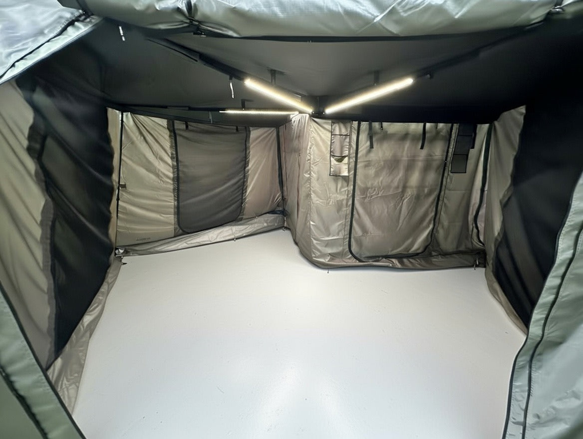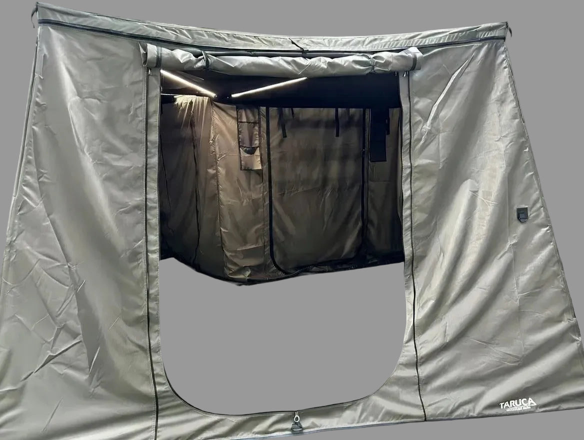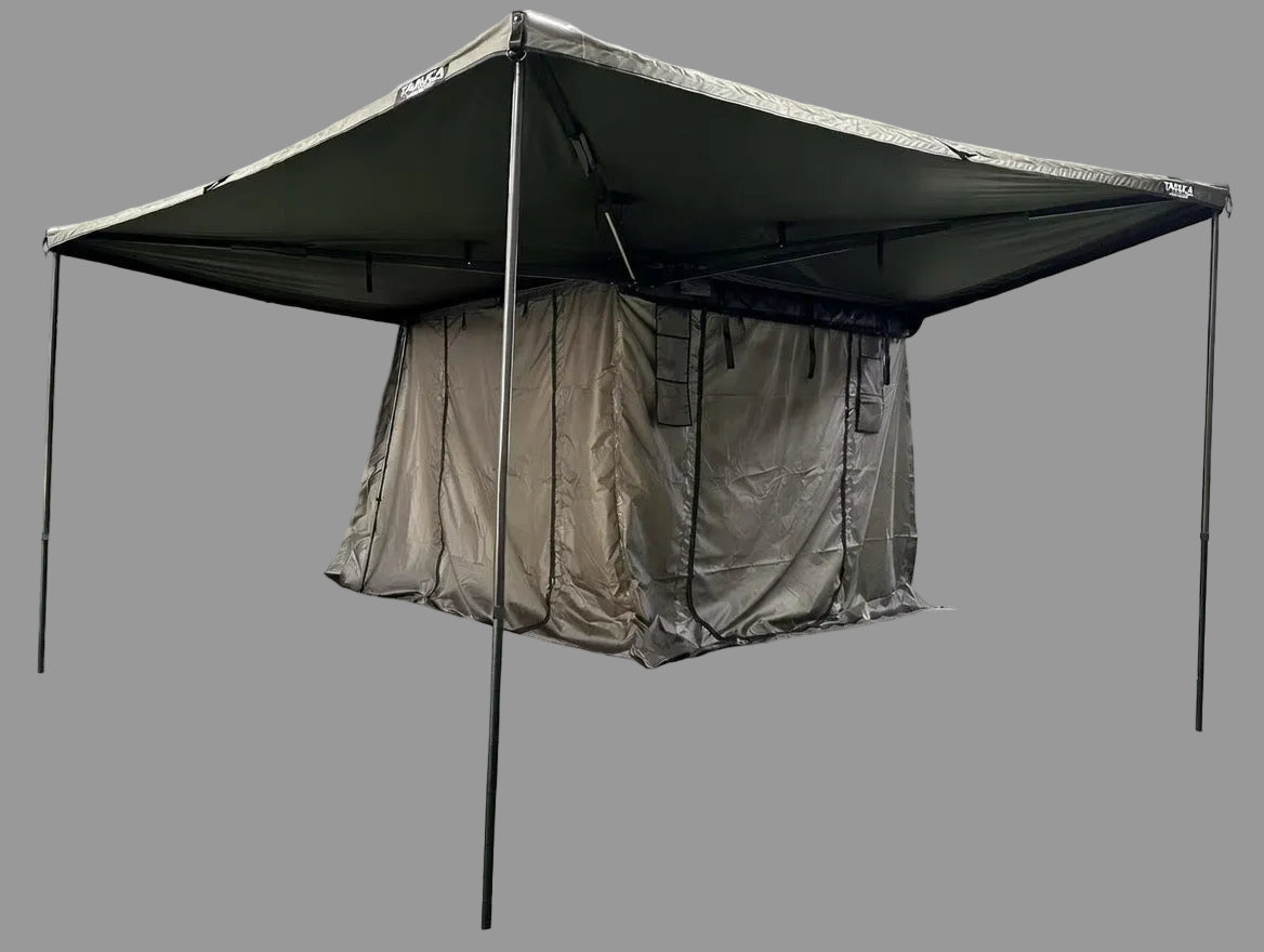 Expanding on the functionality of our awning range, you can now attach this full wall kit enclosure (by the Velcro strips) to the Rogue 270 S on the outside and inside of the awning to create a large area as a dry room and storage during your camping trips.